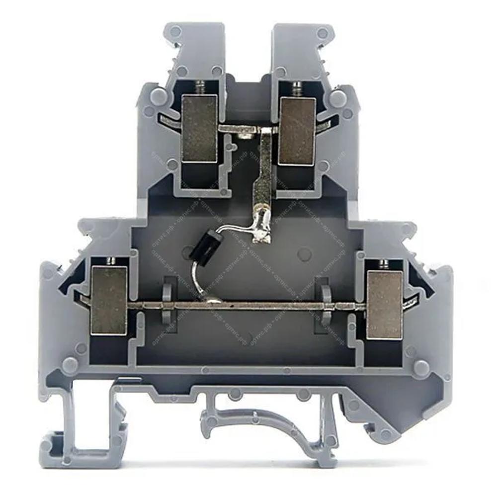 RUG/D-B - Клемма со встроенным диодом 1N4007, CHIKU; Ширина: 6,2 мм; Цвет: Серый; Тип подключения: зажим Винтовой; Количество точек подключения: 4; Количество ярусов: 2; Максимальное сечение провода: однож./многож.: 6 мм² / 4 мм²; Номинальный ток: 32 А; Номинальное напряжение: 500 В; Способ монтажа: DIN-рейка; Материал: Полиамид; Класс воспламеняемости: V-0; Нижняя рабочая температура,°С (при статическом применении): -60; Верхняя рабочая температура, °С (с учетом самонагрева при номинальных параметрах): 110