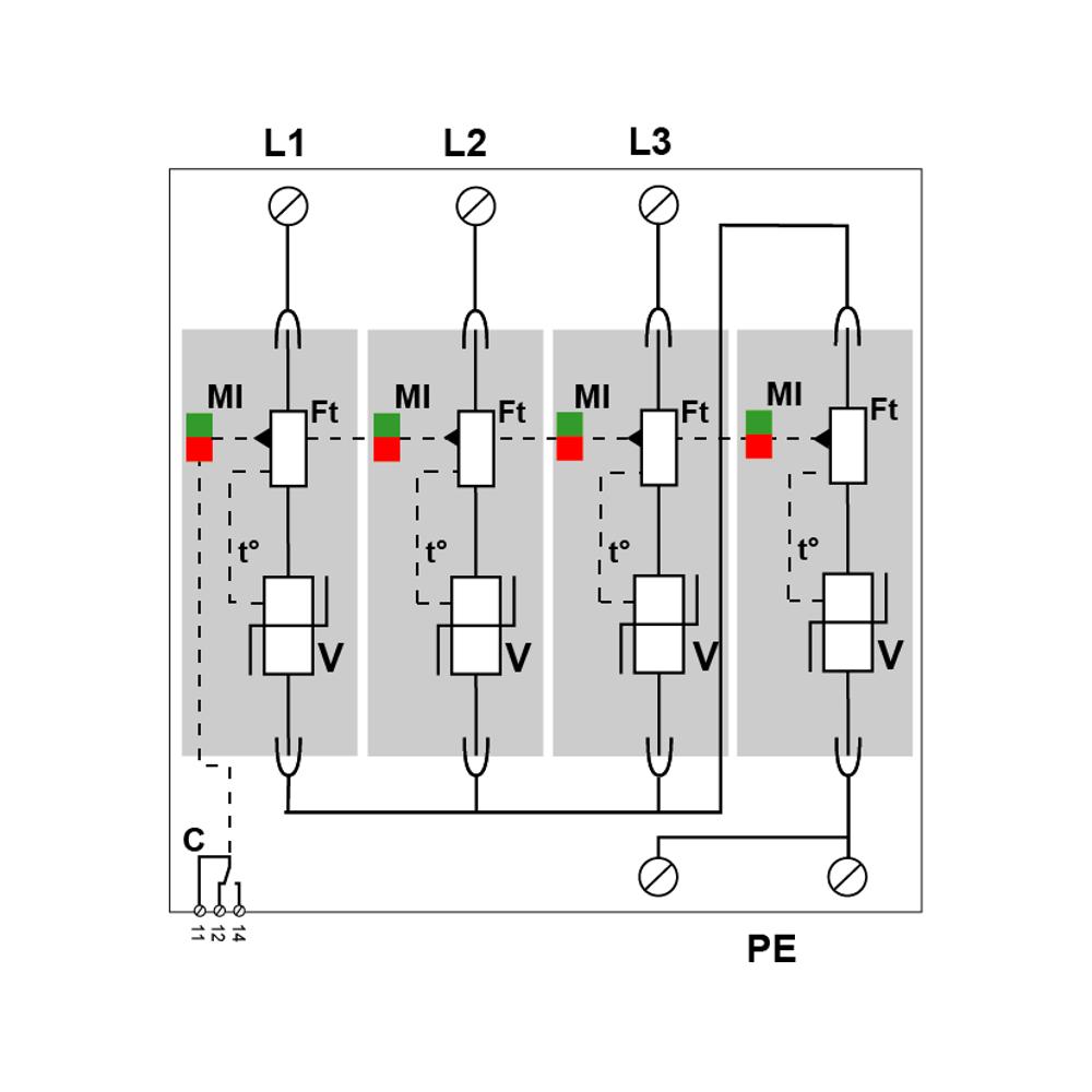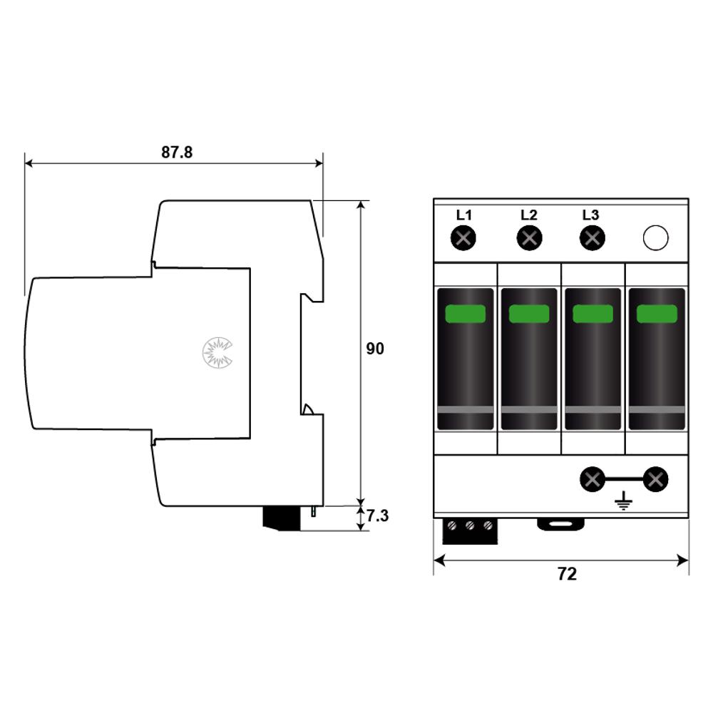 Устройство построено на основе высокоэнергетических варисторов, объединённых в схему «звезда» (Y), что позволяет эффективно работать в трёхфазных сетях с изолированной нейтралью (конфигурация IT). Оно рассчитано на длительную работу в сетях напряжением до 800 В переменного тока и совместимо с системами, где присутствует постоянная составляющая до 1200 В (L/PE). Конструкция выполнена в виде базового корпуса со сменными модулями, что упрощает обслуживание: при срабатывании тепловой защиты модуль легко заменяется на новый без демонтажа всей системы. Для подключения используются винтовые зажимы на кабель сечением от 2.5 до 25 мм², а монтаж осуществляется на стандартную симметричную DIN-рейку 35 мм.