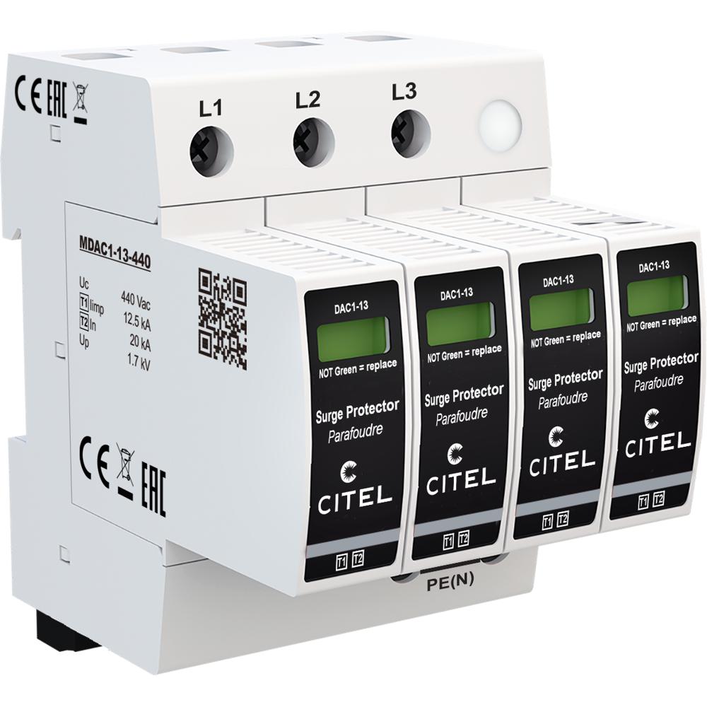 Устройство защиты от импульсных перенапряжений (УЗИП) CITEL DAC1-13S-31Y-880 — это высоконадежный трёхфазный ограничитель перенапряжений типа 1+2 по классификации IEC 61643-11, предназначенный для комплексной защиты фотоэлектрических (PV) инверторов и другого критически важного оборудования в сетях переменного тока. Его основная функция — отвод в землю мощных импульсных токов, возникающих при прямых ударах молнии (тип 1) и коммутационных перенапряжениях (тип 2), обеспечивая максимальную безопасность и бесперебойность работы системы.