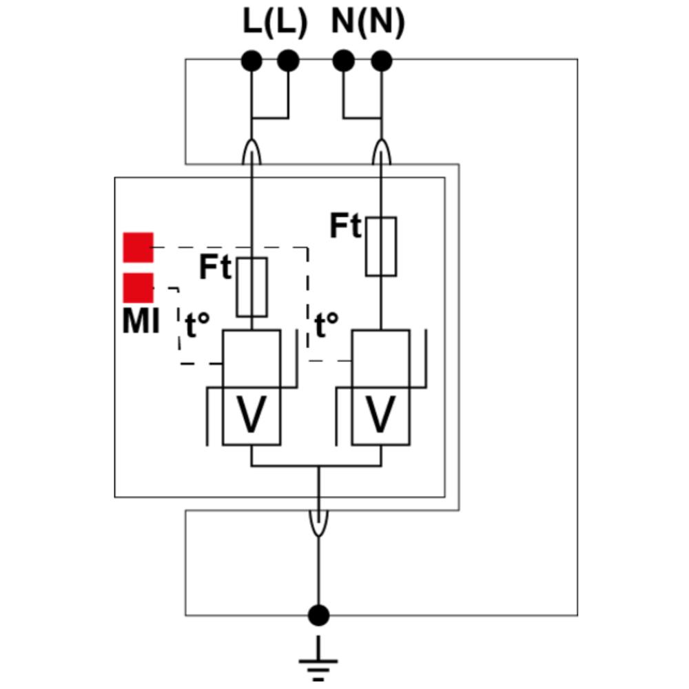 - Компактный однофазный УЗИП Тип 2 с высокой пропускной способностью: номинальный ток разряда (In) 20 кА, максимальный (Imax) 40 кА.