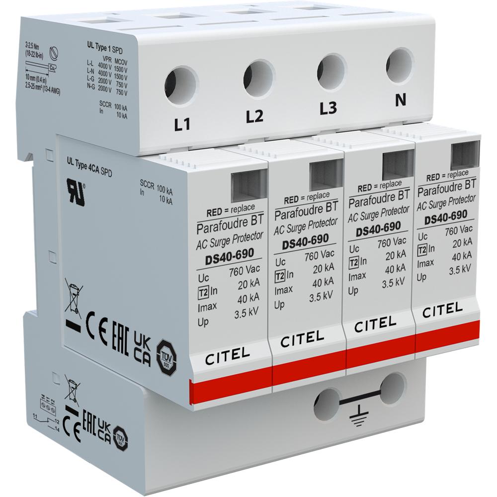 УЗИП Тип 2, Схема (4+0), 4 полюса, TNS, UN400/UC690 Vac, In=20kA, Imax=40kA, Imax total=160kA (сигнализация визуальная)