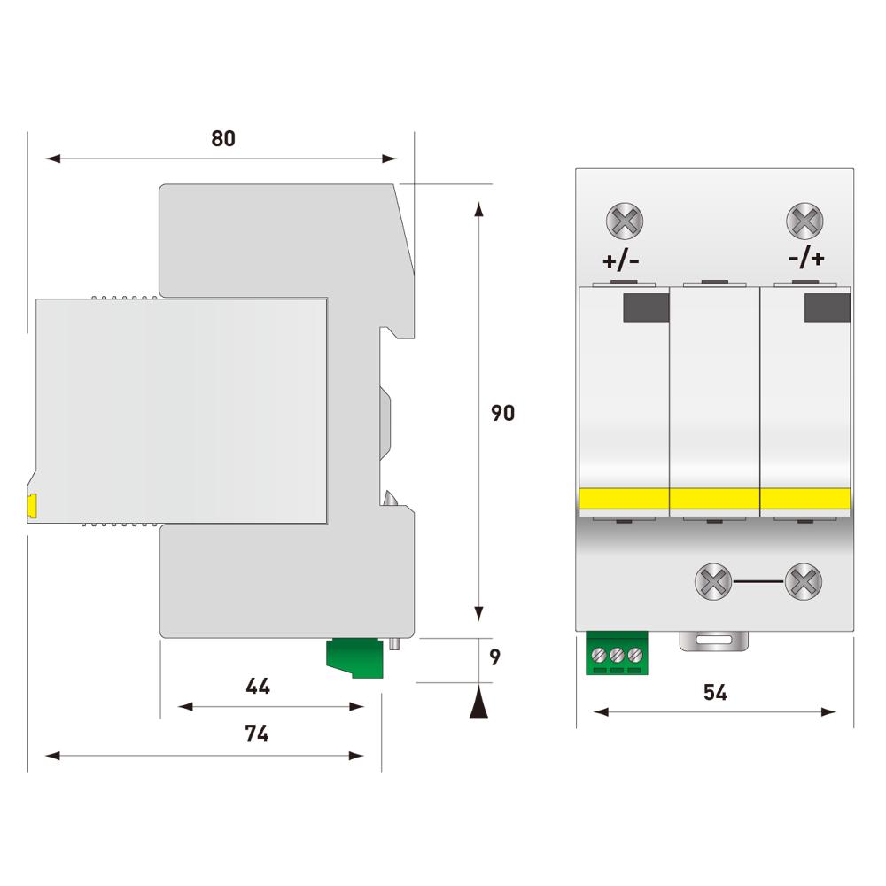Устройство построено на основе высокоэнергетических варисторов и обеспечивает защиту как в дифференциальном (между полюсами +/-), так и в синфазном (между каждым полюсом и землей PE) режимах. Оно предназначено для установки в распределительных щитах постоянного тока фотоэлектрических систем с максимальным рабочим напряжением до 1500 В DC. Монтаж осуществляется на симметричную DIN-рейку 35 мм, а подключение проводов сечением от 2.5 до 25 мм² — к винтовым зажимам. УЗИП соответствует международным стандартам для ФЭ систем EN 61643-31 и EN 50539-11 и имеет сертификацию EAC.