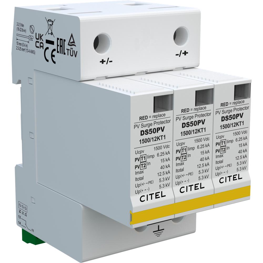 Устройство защиты от импульсных перенапряжений (УЗИП) CITEL DS50PVS-1500/12KT1 предназначено для комплексной защиты фотоэлектрических (ФЭ) систем постоянного тока от разрушительных последствий грозовых и коммутационных перенапряжений. Это устройство класса 1+2 (Тип 1+2) способно отводить на землю мощные импульсные токи молнии, обеспечивая надежную защиту дорогостоящего оборудования солнечных электростанций: фотомодулей, кабельных линий и входных цепей инверторов.